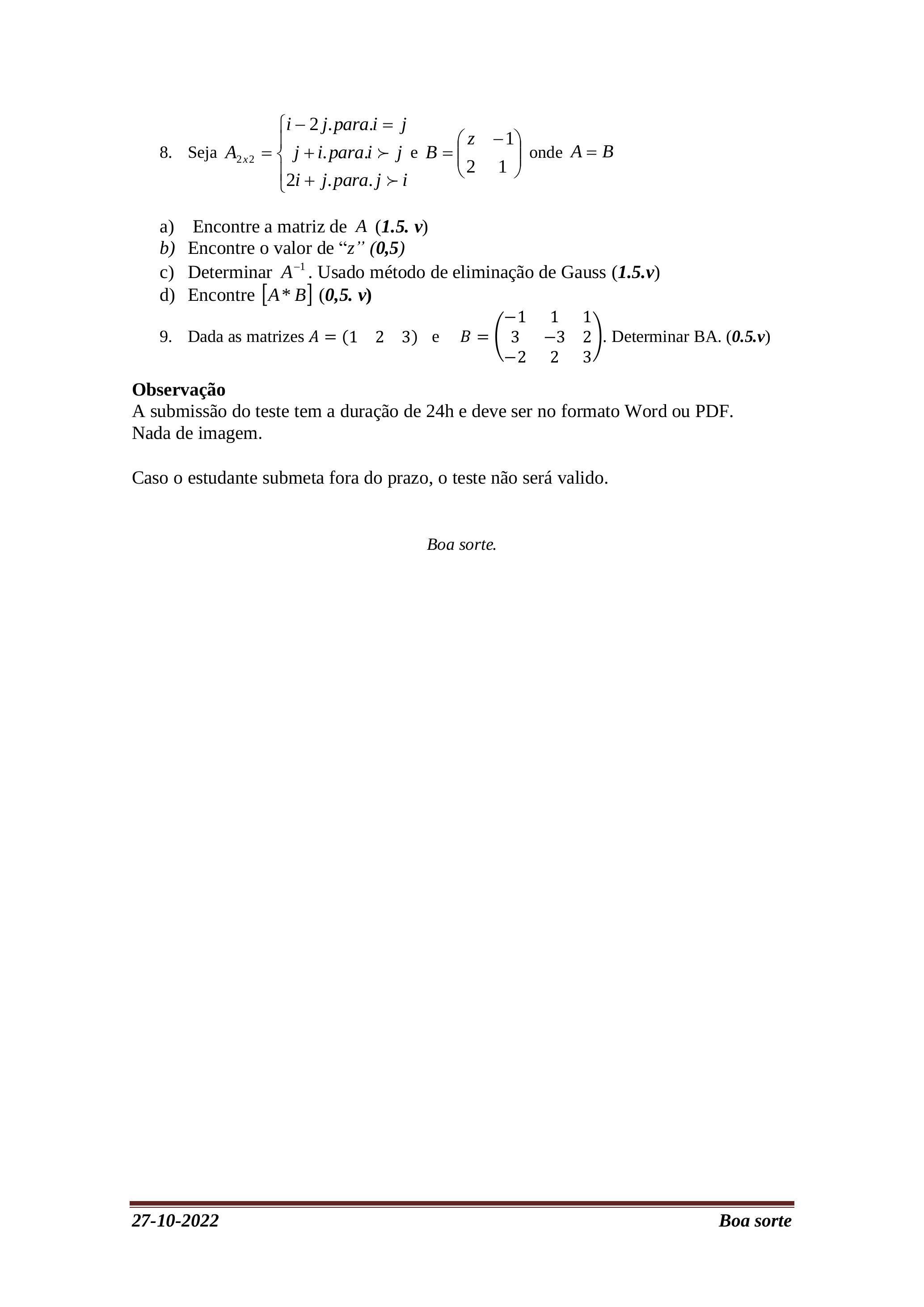 \[ A_{2\times2} = \begin{cases} i-2j, & \text{se } i=j \\ j+i, & \text{se } i>j \\ 2i+j, & \text{se } j>i \end{cases} \]